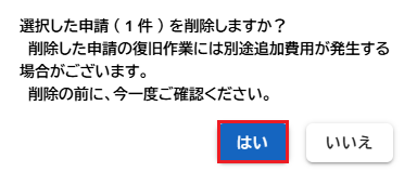 6、削除確認のメッセージを表示します。[はい]をクリックします。([いいえ]をクリックすると、入社手続