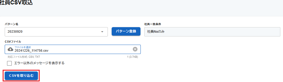 ※選択した明細パターンのCSVと、給与等CSV取込で給与の取込を行う時のパターンが違うCSVは取り込めませ