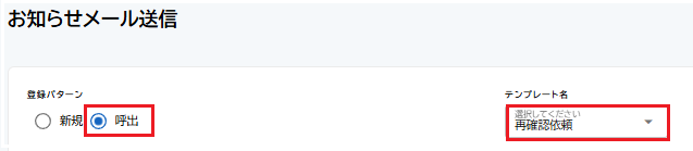 2、お知らせメール送信画面を表示します。『呼出』のチェックとテンプレート名を確認(選択)します。[送信